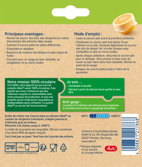 Les couvre-plats en silicone sont réutilisables et très pratiques pour recouvrir des bols, récipients ou directement des aliments déjà coupés. Contient 3 couvre-plats extensibles de 5cm, 8cm et 11cm.Les couvre-plats réutilisables sont extensibles, résistants et parfaitement hermétiques. Ils sont utilisables au congélateur, au micro-ondes et au réfrigérateur. Ils sont lavables au lave-vaisselle.