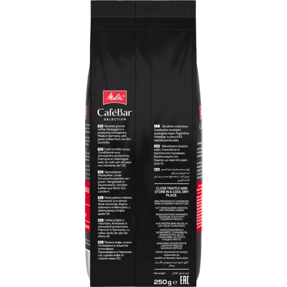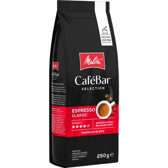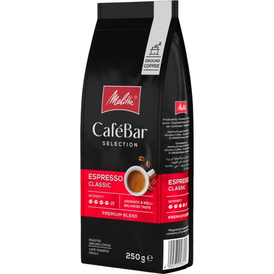 Melitta® CaféBar Sélection Espresso Classic offre une expérience aromatique et sensuelle. C’est un mélange des meilleurs grains Arabica et Robusta soigneusement sélectionnés, puis torréfiés avec soin. Ce café révèle des nuances de chocolat noir légèrement sucré, associées à de fines notes de fruits secs. Avec Melitta® CaféBar Sélection, vivez l’ambiance vibrante d'un coffee shop chez vous, avec la garantie de déguster un café parfaitement préparé, adapté à vos goûts et à celles et ceux que vous aimez.