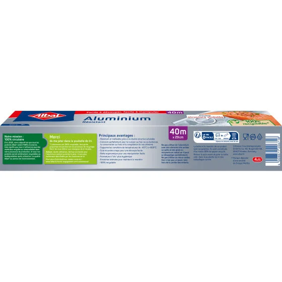 'Papier Aluminium résistant 40m ALBAL L'aluminium Albal est la solution simple, pratique et hygiénique pour conserver vos restes au réfrigérateur et réussir parfaitement la cuisson de vos plats au four et de vos grillades au barbecue.Résistant et malléable grâce à sa double structure alvéolée, il peut supporter des variations de températures de -40°C à +600°C. Facile d'utilisation, il se découpe en un seul geste sans se déchirer.