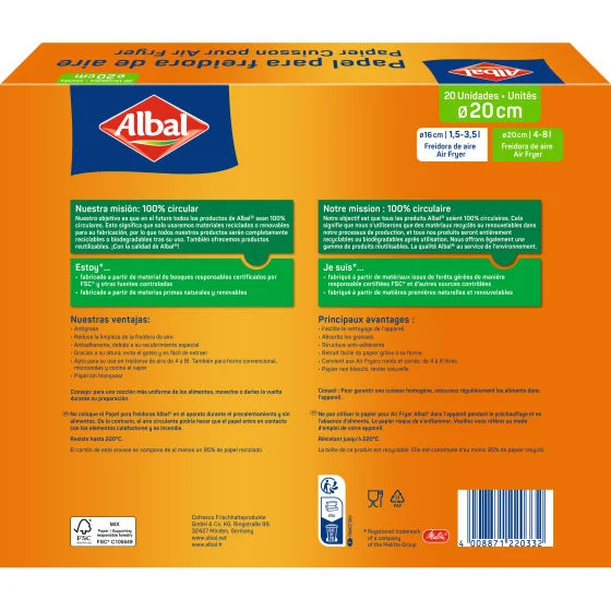 Le Papier Cuisson pour Air Fryer facilite le nettoyage de l'appareil et absorbe les graisses. Il est doté d'une structure anti-adhérente et convient aux Air Fryers ronds et carrés de 4 à 8 litres.Votre appareil Air Fryer est facile à nettoyer grâce au Papier Cuisson pour Air Fryer Albal(r) qui absorbe les graisses et empêche les résidus d'aliments de se déposer au fond du panier.