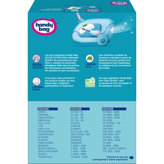Sac Haute Filtration - Retient 99,99% des particules les plus fines - Système de fermeture hygiénique et pratique - Filtre anti-allergène inclus - 50% de matériaux recyclés.