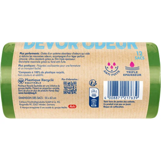 Le sac à poignées coulissantes Dévor Odeur est doté d'un système absorbeur qui aide à réduire les mauvaises odeurs. Il est étanche grâce à son film triple épaisseur et à son fond anti-fuite.Système absorbeur d'odeurs - Ultra Résistant grâce à son film triple épaisseur - Fond anti-fuite pour une étanchéité maximale - 100% plastique recyclé, hors couleurs et additifs.
