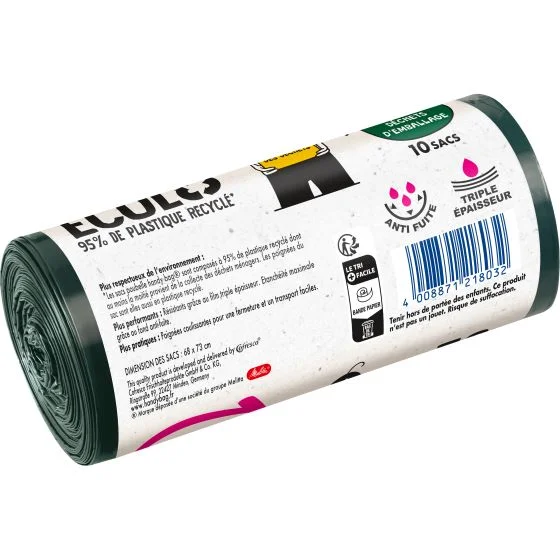 Le sac à poignées coulissantes Écolo est composé à 100% de plastique recyclé issu du tri des déchets ménagers. Il est résistant et étanche grâce à son film triple épaisseur et son fond anti-fuite.Résistant et écolo : un film triple épaisseur pour plus de résistance - Étanchéité maximale - 100% plastique recyclé issu de la collecte et du tri des déchets ménagers, hors couleurs et additifs.