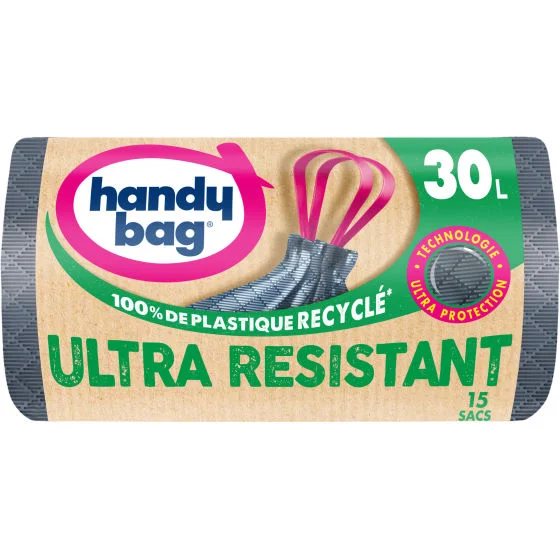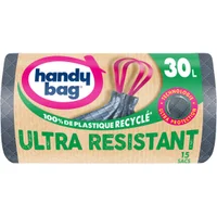Sacs poubelle poignées coulissantes Ultra Résistant 30L x15, 100% plastique recyclé, Handy Bag