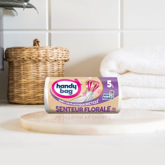 Sacs poubelle salle de bains poignées coulissantes senteur florale 5L x20, 100% plastique recyclé, Handy Bag